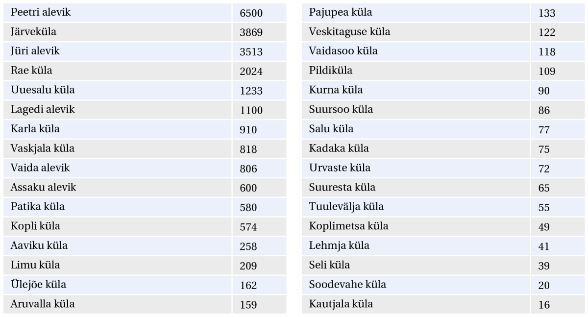 Meie vallas on 5 alevikku ja 27 küla. Suurim neist on 6500 elanikuga Peetri alevik. Valla kõige suuremas külas, Järvekülas elab 3869 inimest. Samal ajal on meie kõige väiksemas, Kautjala külas vaid 16 elanikku. 51 inimese elukoht on registreeritud Rae valla täpsusega ehk nemad ei kuulu konkreetselt ühegi asula alla.